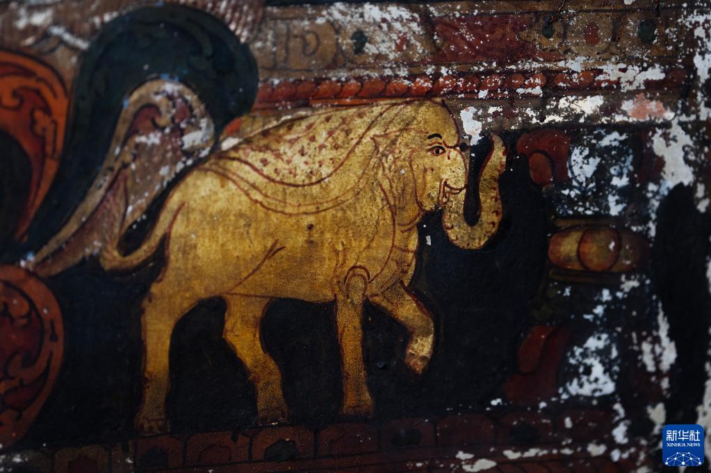 這是5月26日拍攝的皮央石窟壁畫(huà)中的大象像。