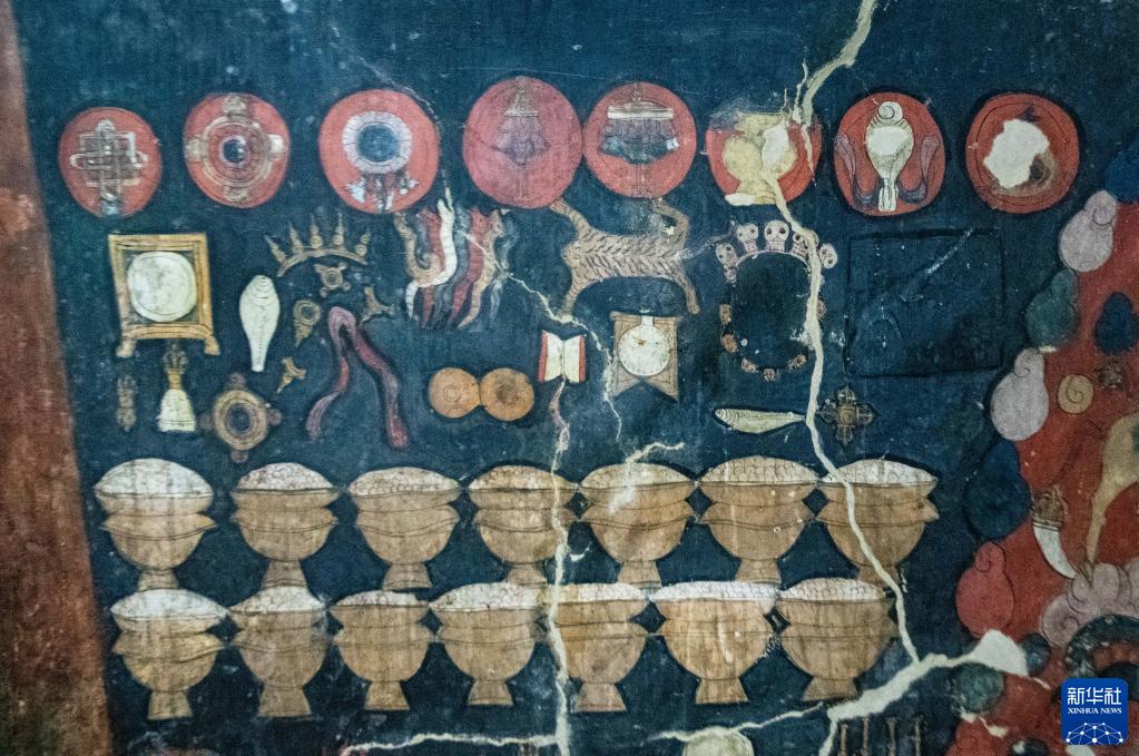 這是5月26日拍攝的皮央石窟壁畫(huà)中的吉祥八寶。