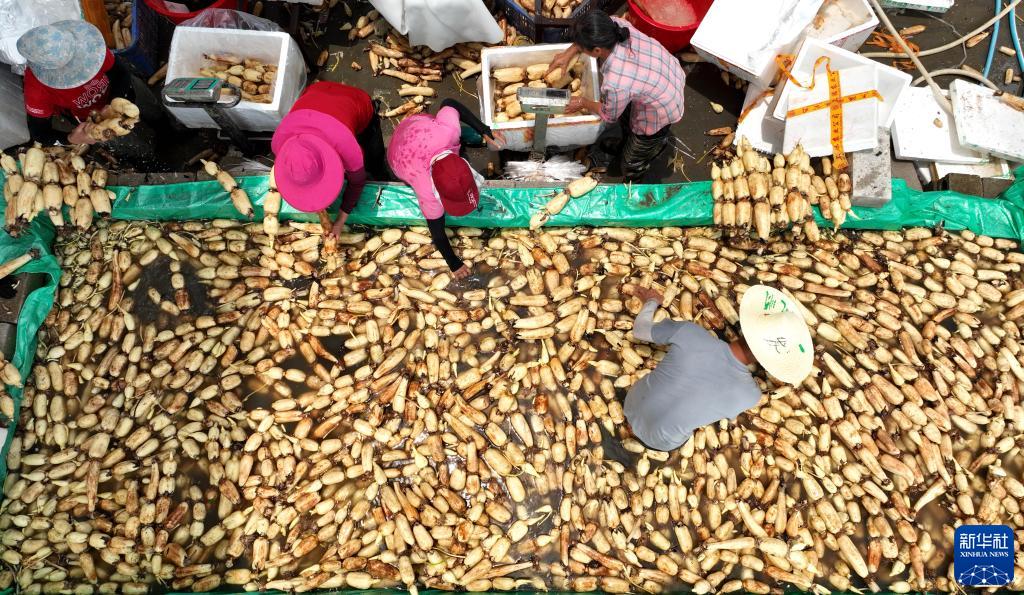 5月29日,在廣西柳州市柳江區百朋鎮,農民在藕田邊的收購點(diǎn)清洗蓮藕(無(wú)人機照片)。