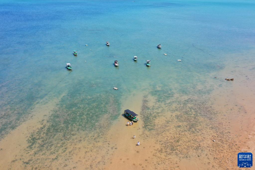 5月28日,游客在中國大陸最南端的“南極村”趕海(無(wú)人機照片)。