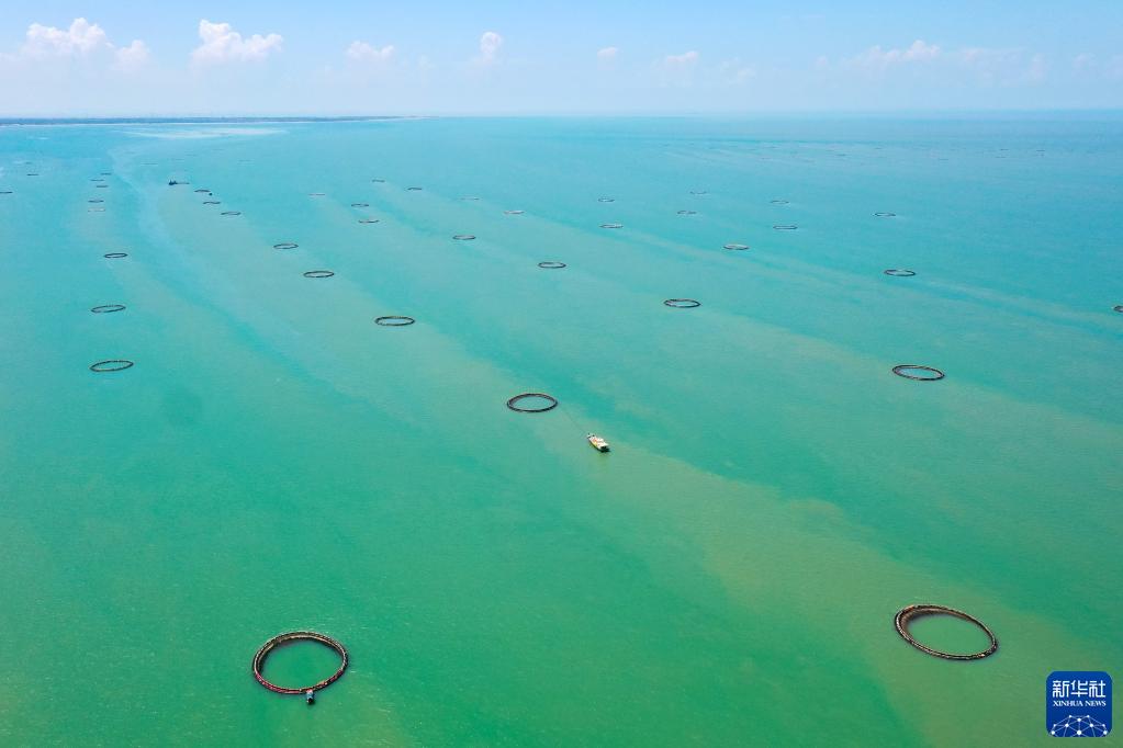 在湛江市徐聞縣西連鎮,徐聞國橋深海養殖有限公司的金鯧魚(yú)深海網(wǎng)箱整齊排列(5月27日攝,無(wú)人機照片)。