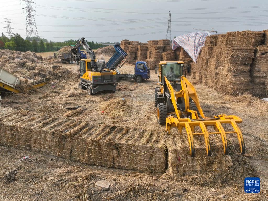 5月29日,在江蘇省泰興市濟川街道眾賢村秸稈收集點(diǎn),農機手將打捆好的油菜秸稈進(jìn)行堆放(無(wú)人機照片)。