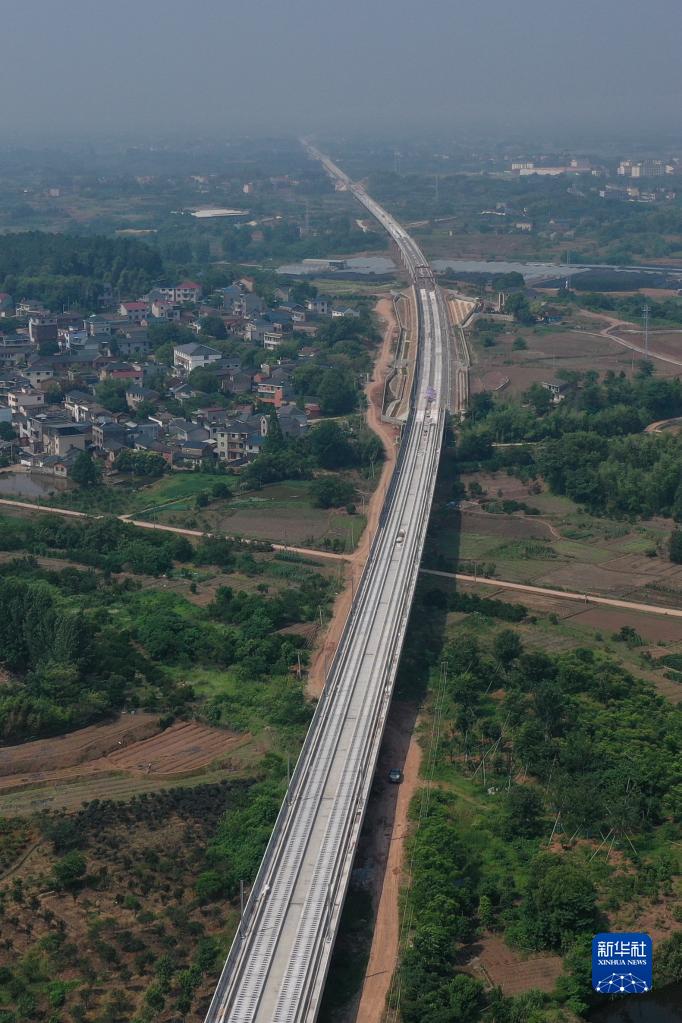 5月30日在浙江省龍游縣境內拍攝的杭衢鐵路無(wú)砟軌道施工現場(chǎng)(無(wú)人機照片)。