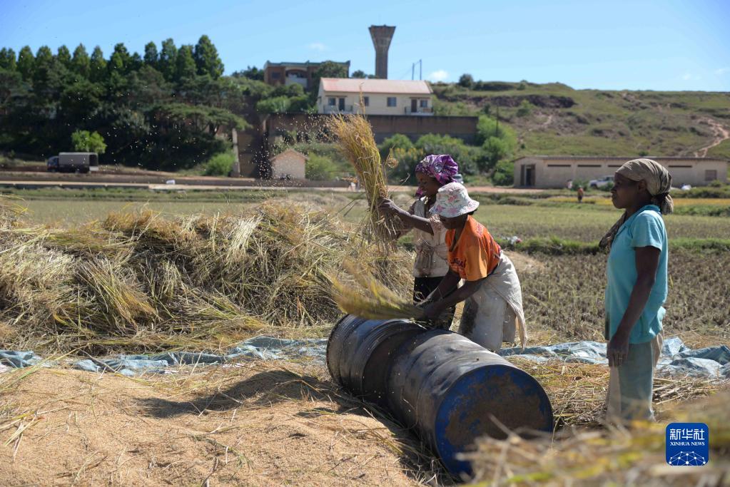 5月12日,在馬達加斯加首都塔那那利佛附近的馬義奇鎮,農民在中國國家雜交水稻工程技術(shù)研究中心非洲分中心的試驗田里收獲水稻。