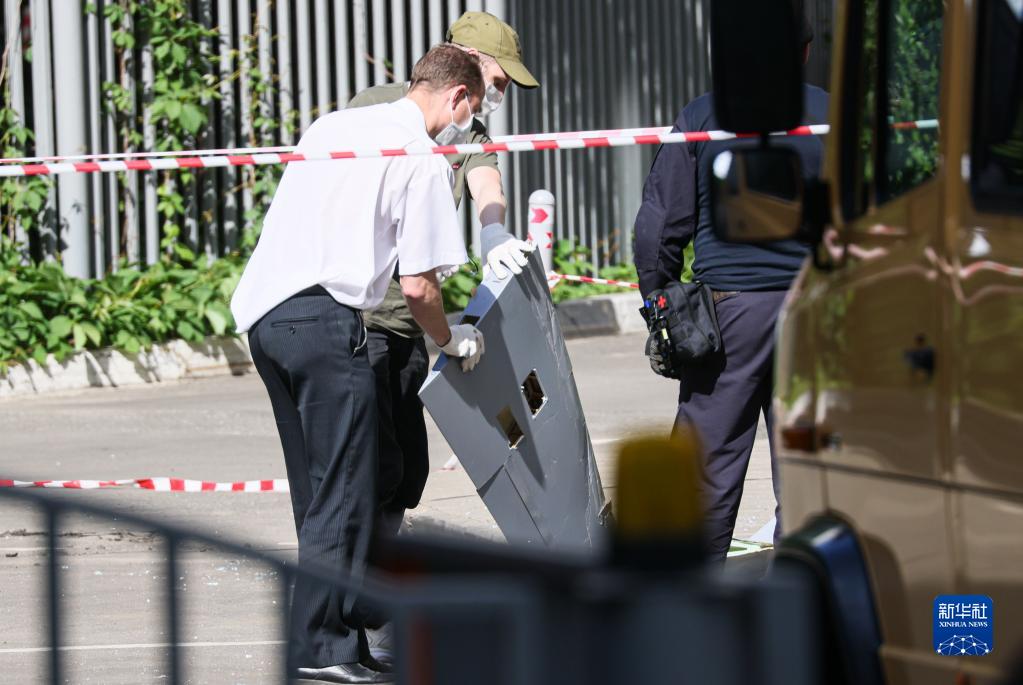 5月30日,工作人員在俄羅斯莫斯科處理無(wú)人機殘骸。
