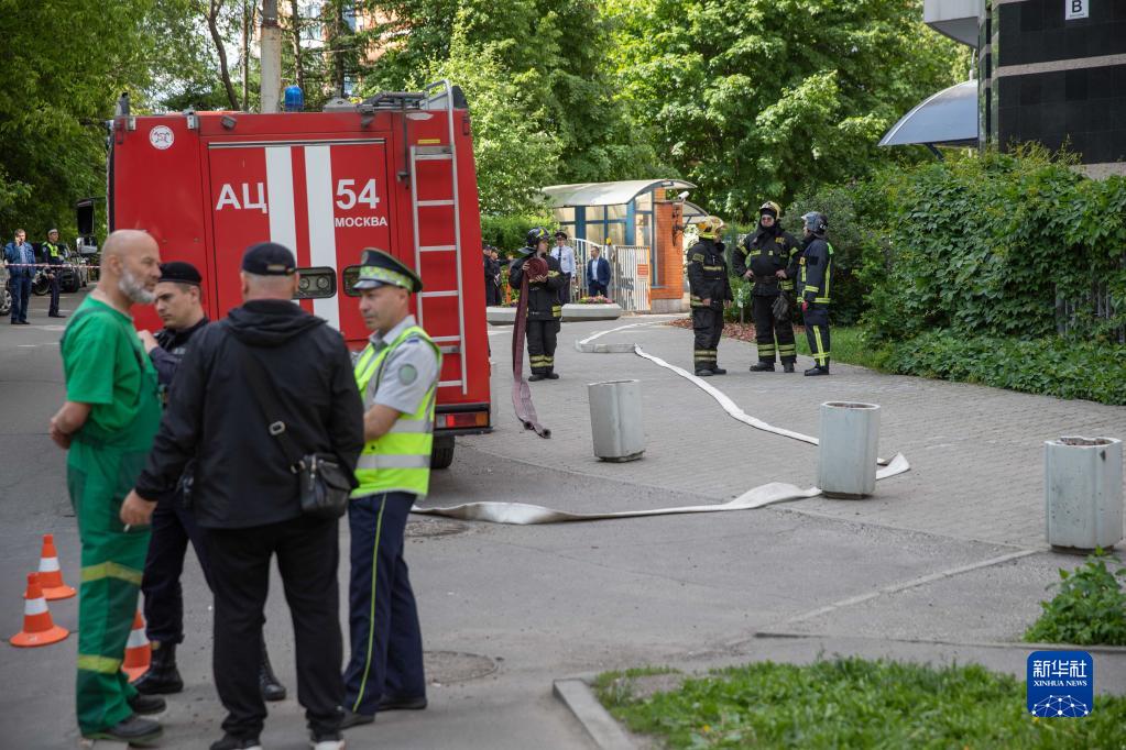 5月30日,消防員聚集在俄羅斯首都莫斯科的樓房遭襲現場(chǎng)。