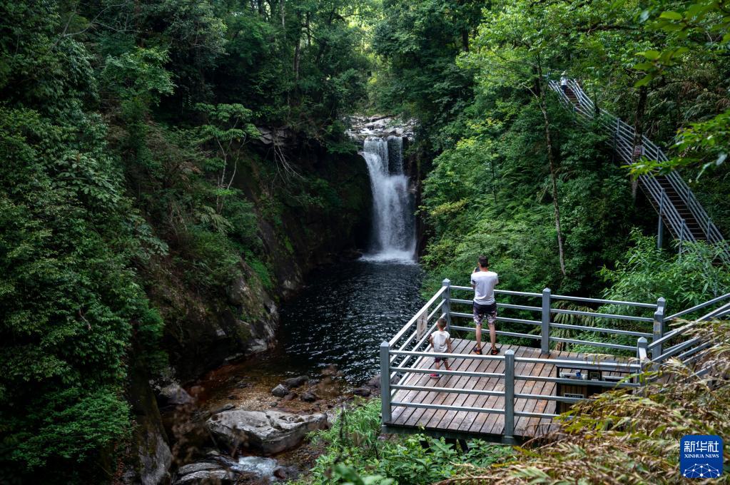 5月29日,游客在坪河草地景區一觀(guān)景臺拍攝瀑布。