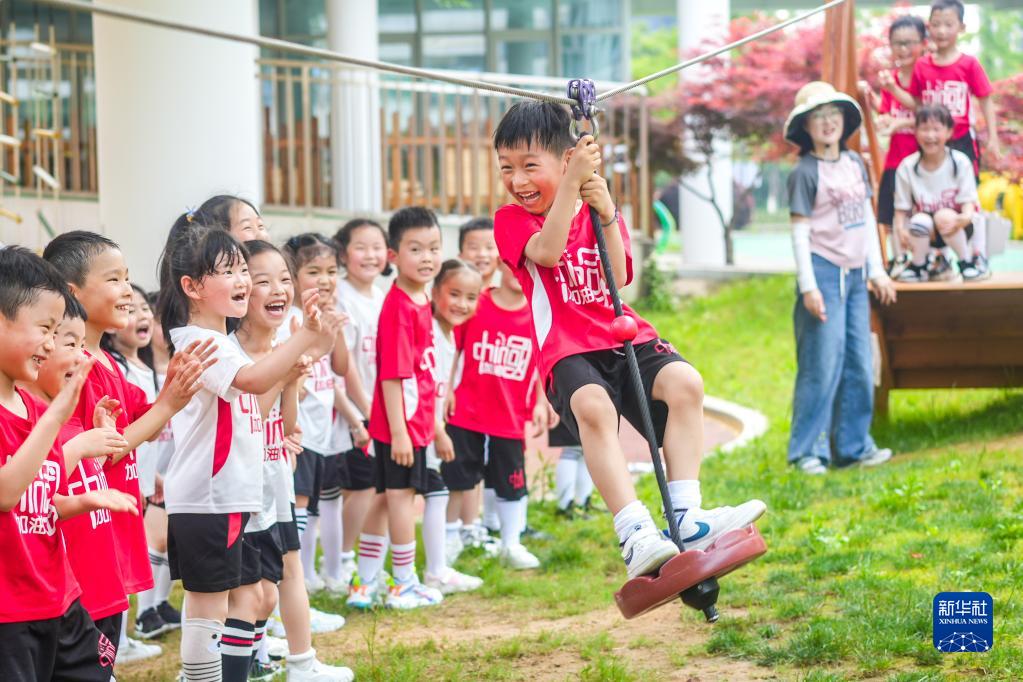 5月31日,在浙江省湖州市長(cháng)興縣龍山街道中心幼兒園,孩子們進(jìn)行“快樂(lè )滑索”趣味游戲。