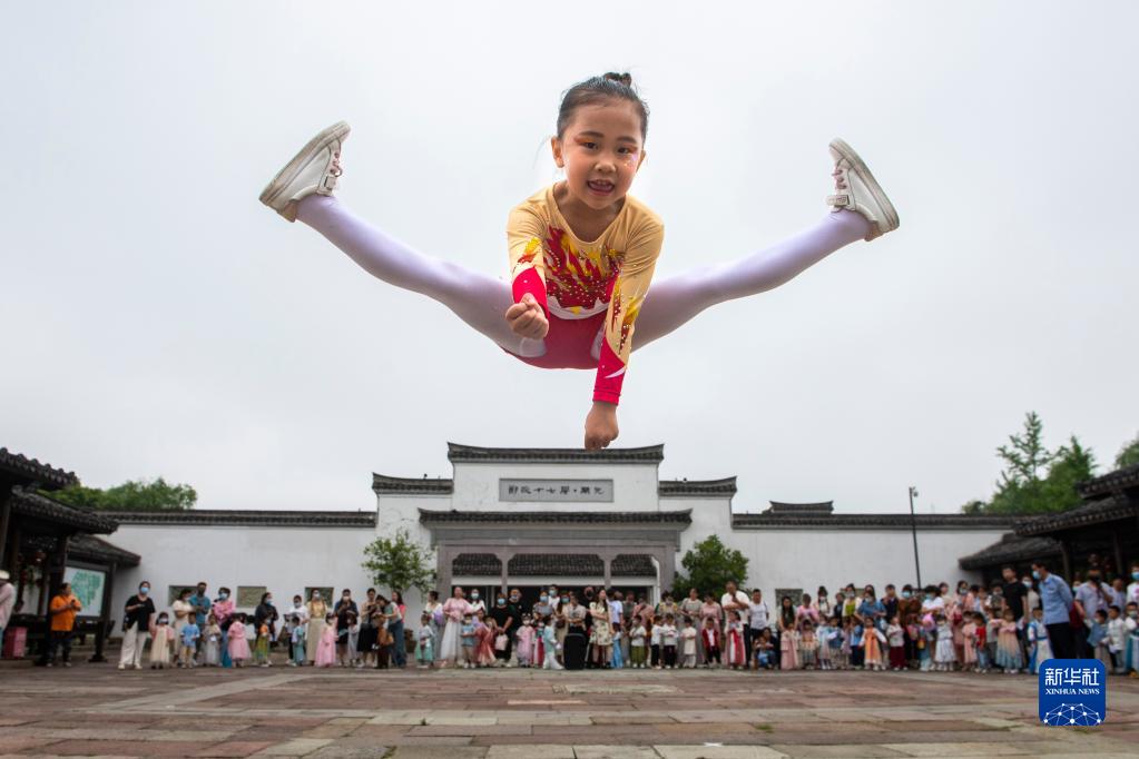 5月31日,浙江省寧波市鎮海區澥浦鎮中心幼兒園小朋友在鄭氏十七房進(jìn)行蹦床表演。