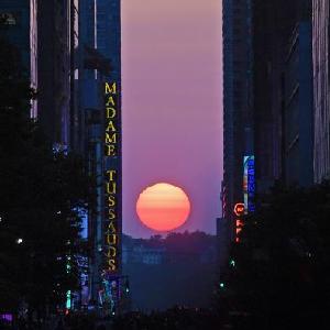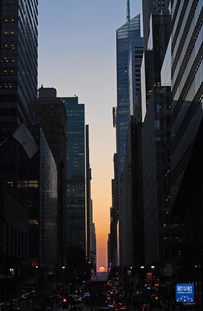 當日,紐約出現“曼哈頓懸日”景觀(guān)?!奥D懸日”是紐約市標志性景觀(guān),每年5月和7月出現兩次,指日落時(shí)太陽(yáng)正好出現在曼哈頓東西向街道正上方、似乎懸在兩側高樓大廈之間的戲劇性畫(huà)面。