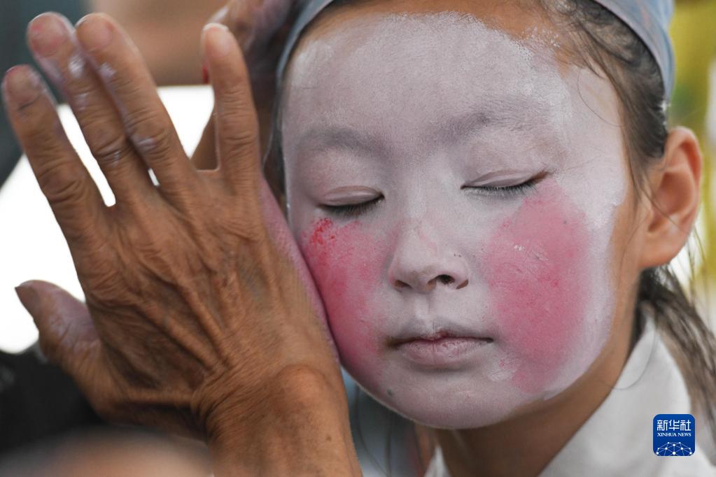 5月30日,民間老藝人在給伏嶺鎮中心小學(xué)“徽劇童子班”的學(xué)生化妝。