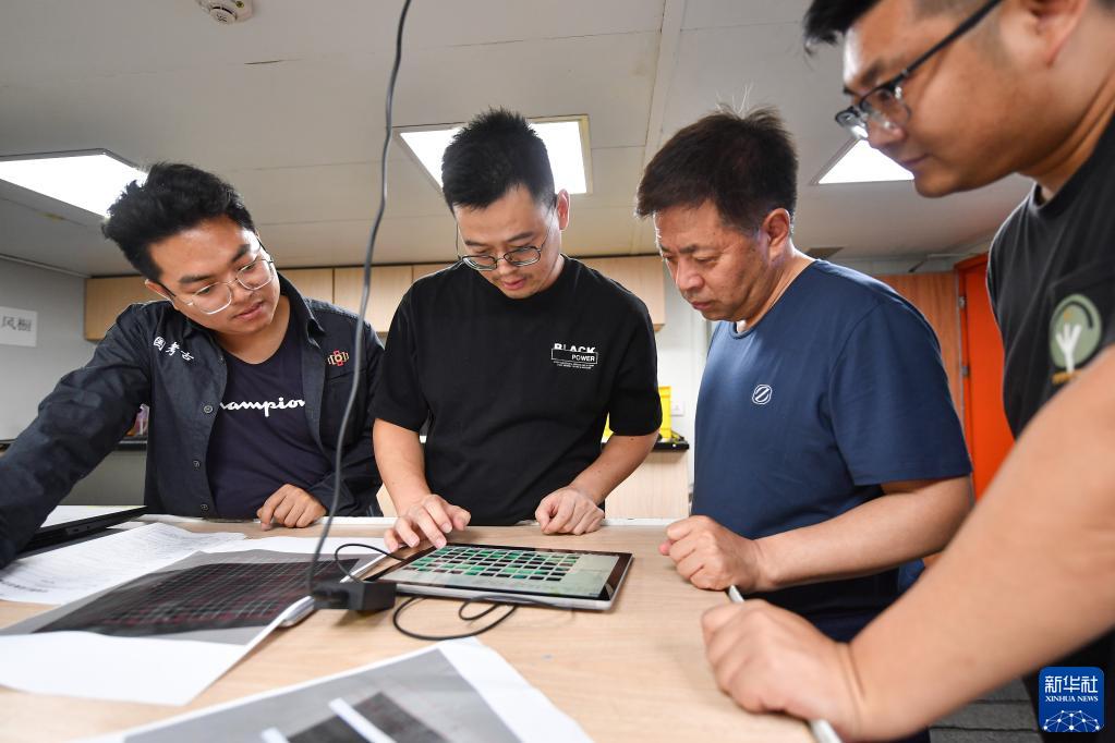 考古隊員在“探索一號”科考船上查看從水下采集的考古數據(5月24日攝)。