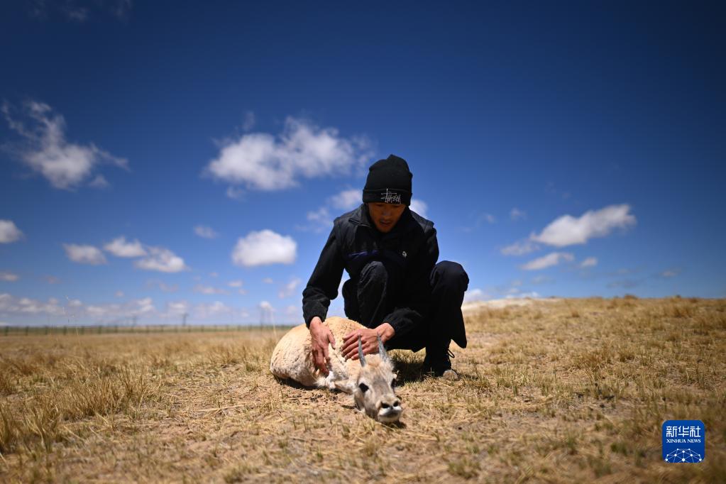 在可可西里國家級自然保護區索南達杰保護站,巡山隊員才文多杰在野生動(dòng)物救助中心查看被救助的藏羚羊身體狀況(5月30日攝)。