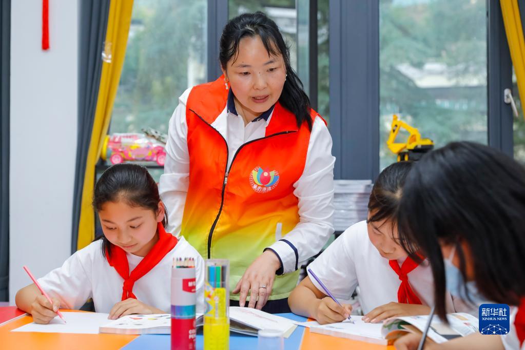 孩子們下課后來(lái)到四川巴中市南江縣集州街道楊家河社區的“童心港灣”,“童伴媽媽”吳莉陪著(zhù)她們畫(huà)畫(huà)(5月25日攝)。