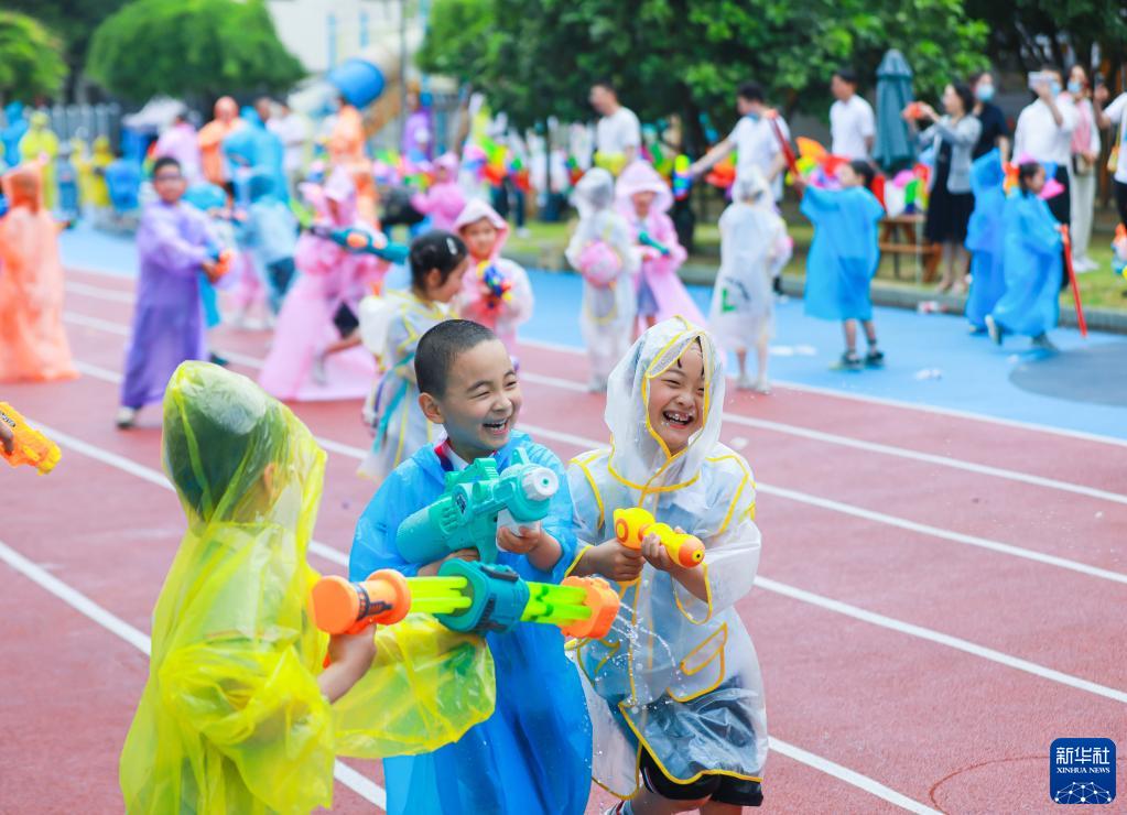 5月31日,在浙江省舟山市定海區機關(guān)幼兒園,孩子們玩起水槍大戰。