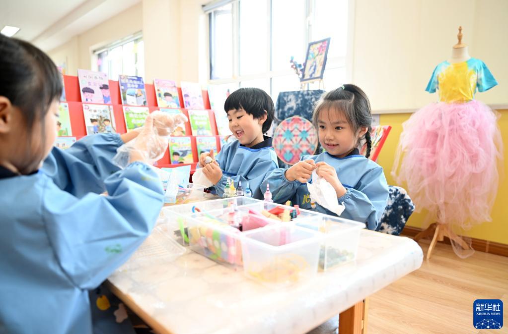 5月31日,在天津市和平區第五幼兒園,小朋友學(xué)習制作扎染。