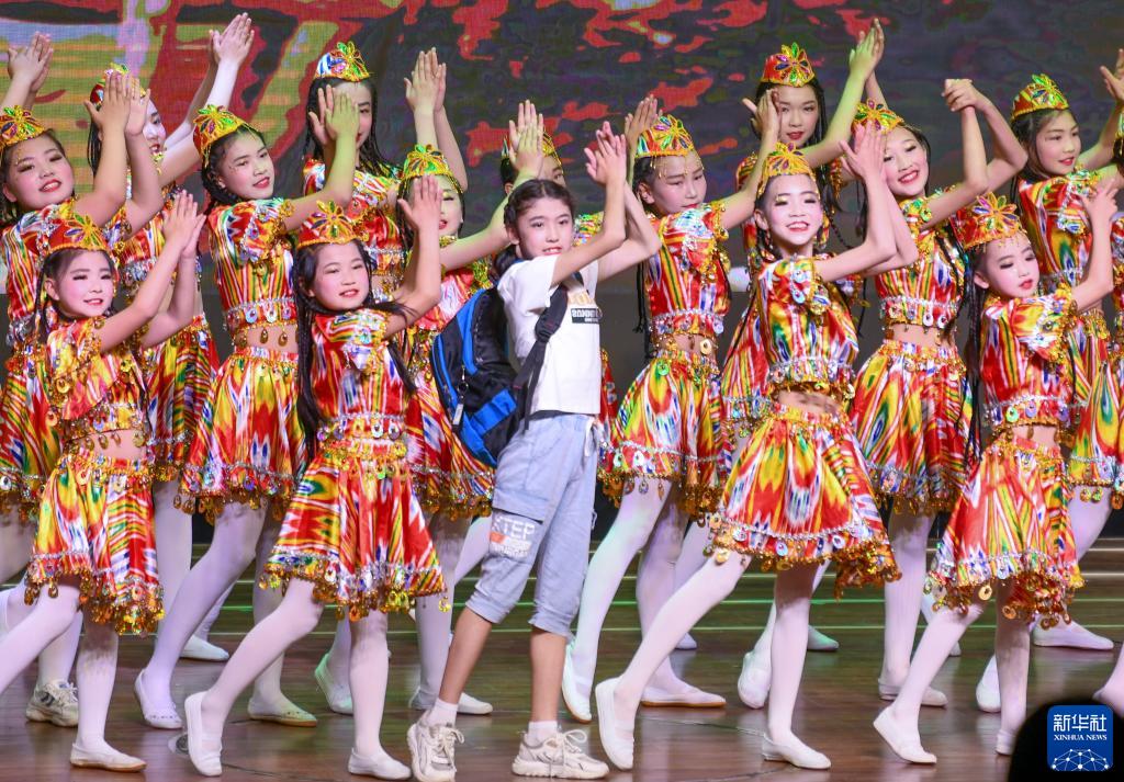 5月31日,新疆烏魯木齊縣中梁小學(xué)的學(xué)生在文藝演出中表演舞蹈。