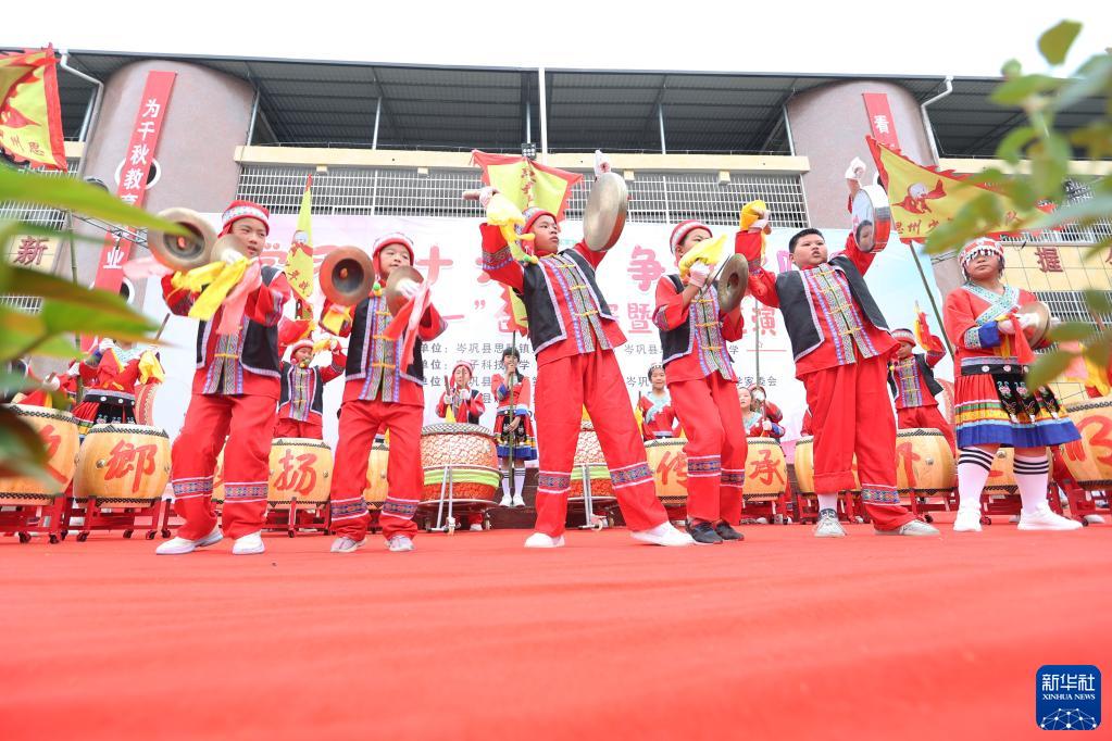 5月31日,在貴州省岑鞏縣思旸鎮第一小學(xué),學(xué)生在文藝匯演中表演“非遺戰鼓”節目。