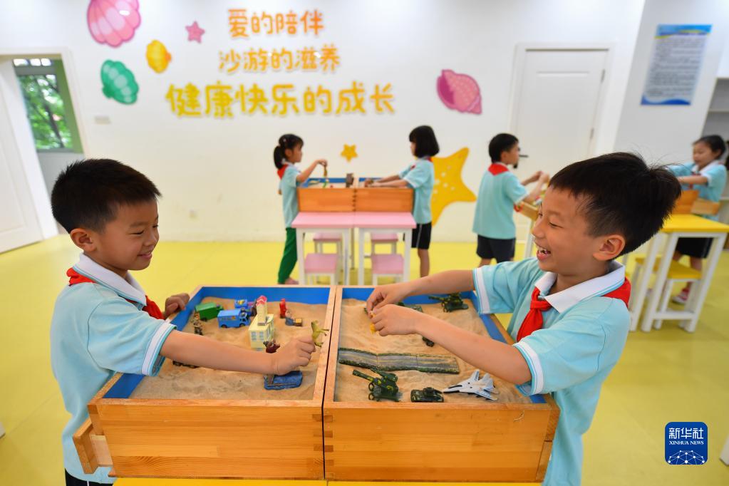 5月31日,在長(cháng)沙市岳麓區實(shí)驗小學(xué)“心語(yǔ)花溪”心理成長(cháng)中心的沙盤(pán)游戲室,學(xué)生在玩沙盤(pán)游戲。