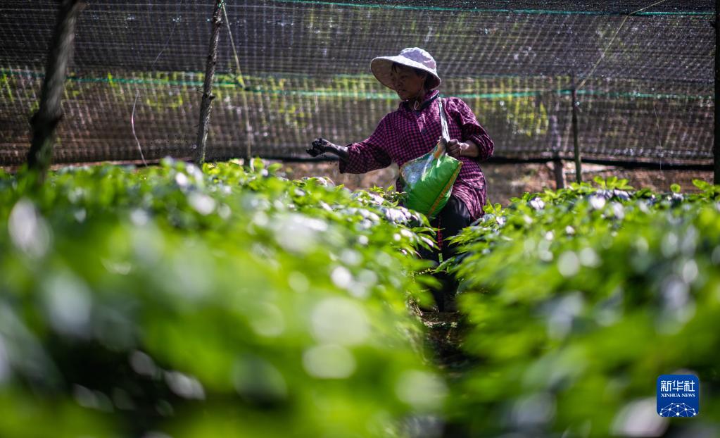 5月31日,在文山州西疇縣蓮花塘鄉一個(gè)三七種植基地,農民在給三七施肥。
