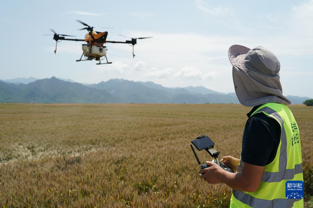 5月30日,西安市長(cháng)安區長(cháng)豐農機專(zhuān)業(yè)合作社的飛手在操作植保無(wú)人機進(jìn)行植保作業(yè)。