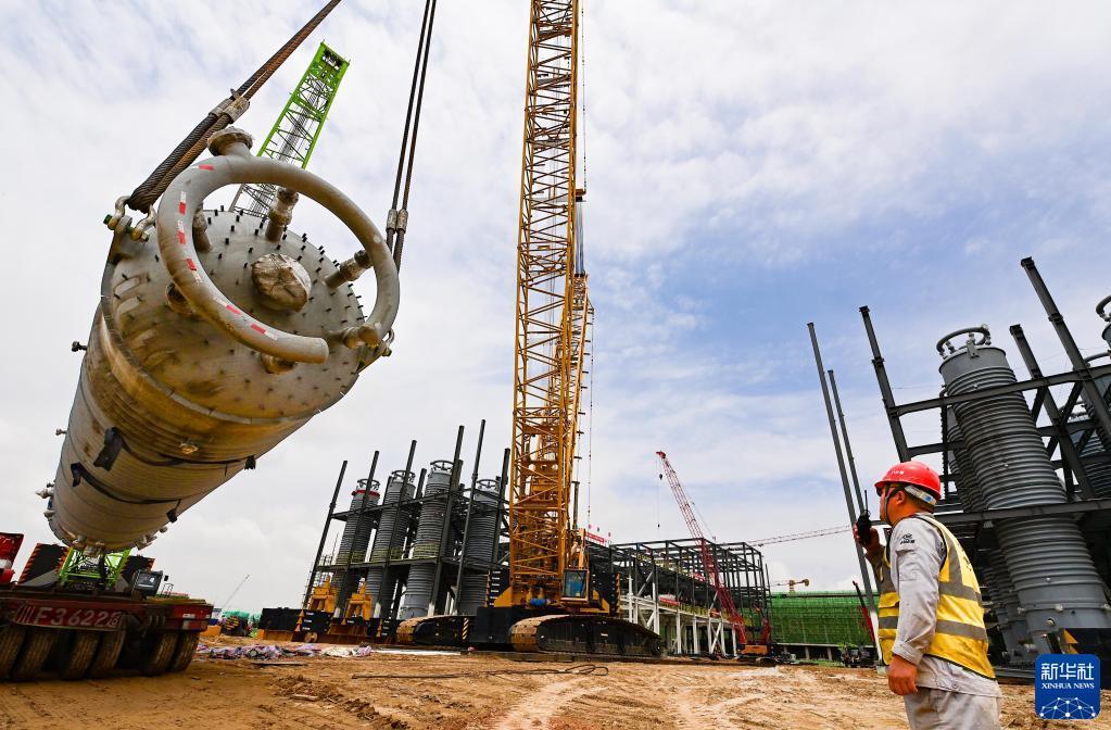 6月1日,工人在鄂托克前旗光伏裝備制造全產(chǎn)業(yè)鏈科技示范項目施工現場(chǎng)安裝設備。