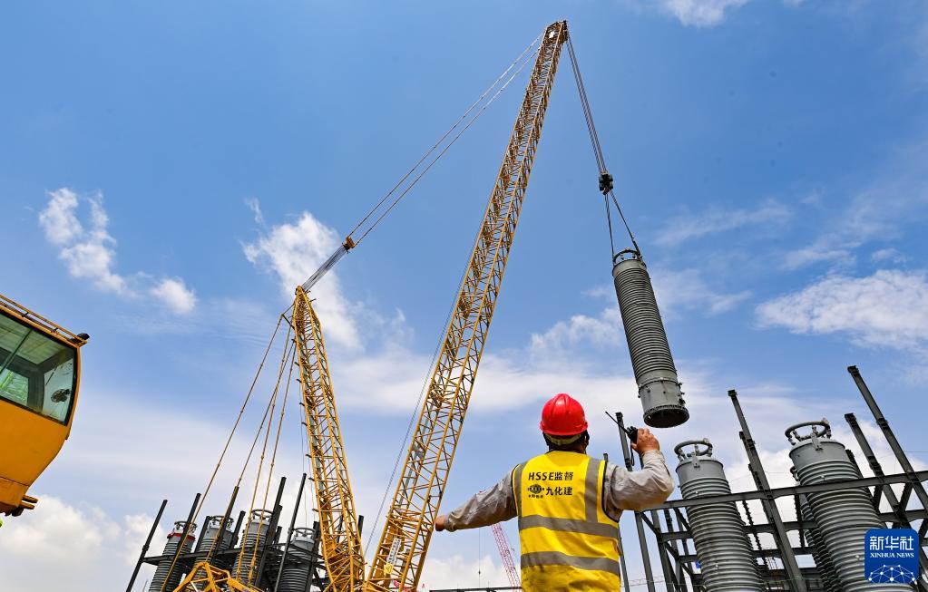 6月1日,工人在鄂托克前旗光伏裝備制造全產(chǎn)業(yè)鏈科技示范項目施工現場(chǎng)安裝設備。