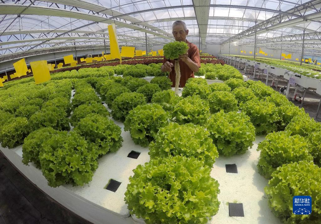 6月1日,在石家莊藁城區河北炫夢(mèng)農業(yè)科技有限公司霧培生菜聯(lián)棟溫室大棚,工作人員在收獲生菜。