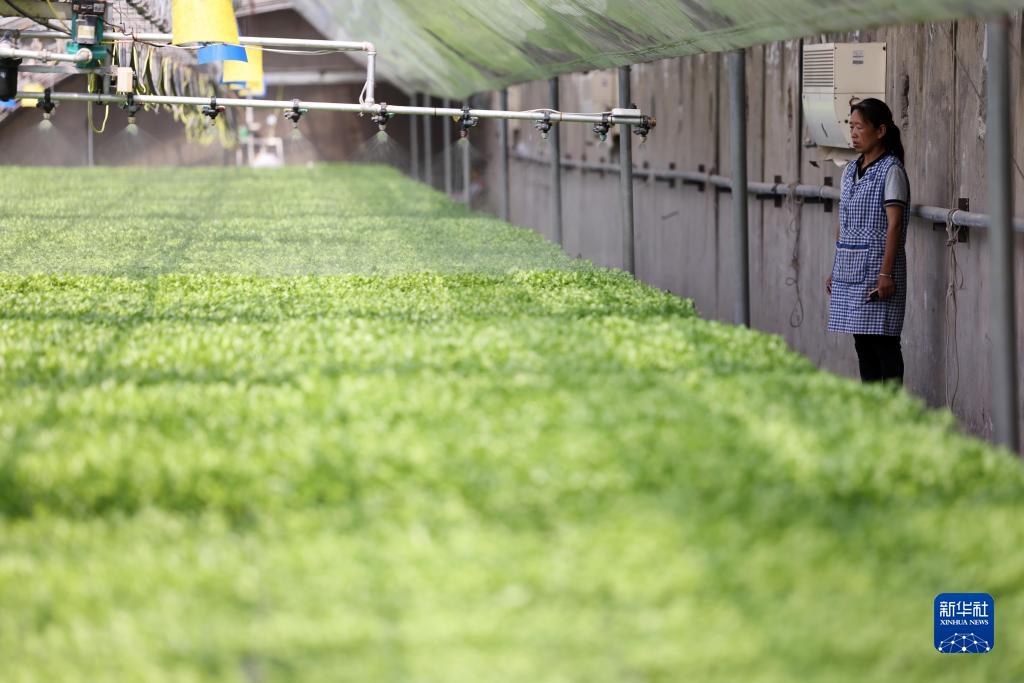 6月1日,在石家莊藁城區河北勤盛種苗科技有限公司育苗溫室,工作人員操控自動(dòng)化噴淋設備為西芹種苗澆水。