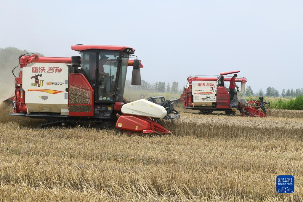 6月1日,在安徽省阜陽(yáng)市阜南縣曹集鎮阜蒙農場(chǎng),收割機在收割小麥。