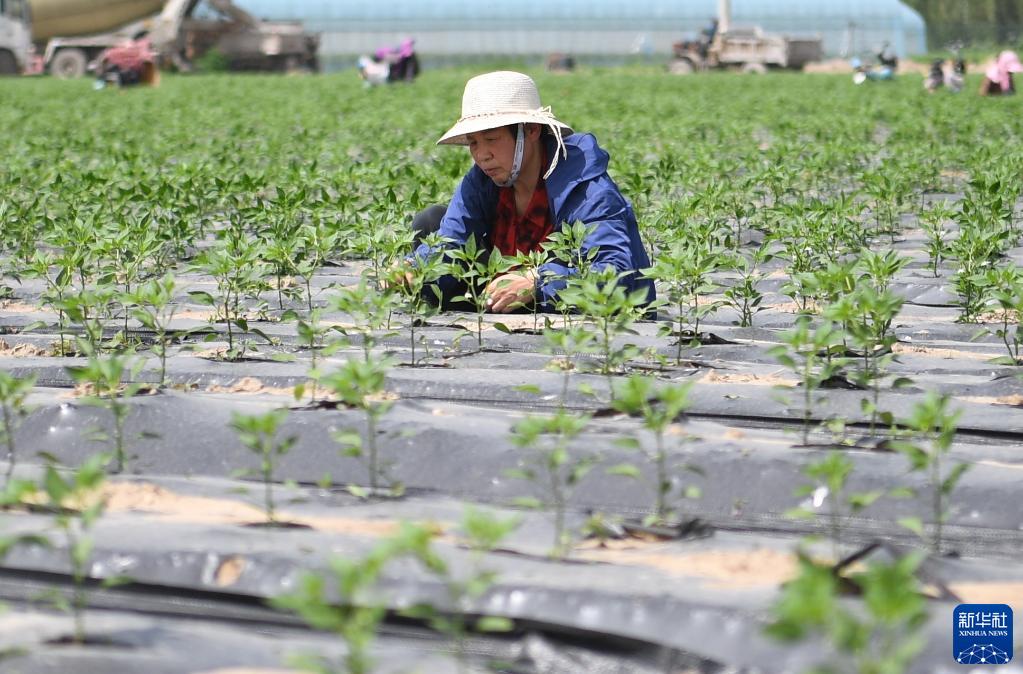 6月1日,河北雄安新區安新縣陽(yáng)雀湖西里現代農業(yè)產(chǎn)業(yè)園區工人在管護辣椒秧苗。