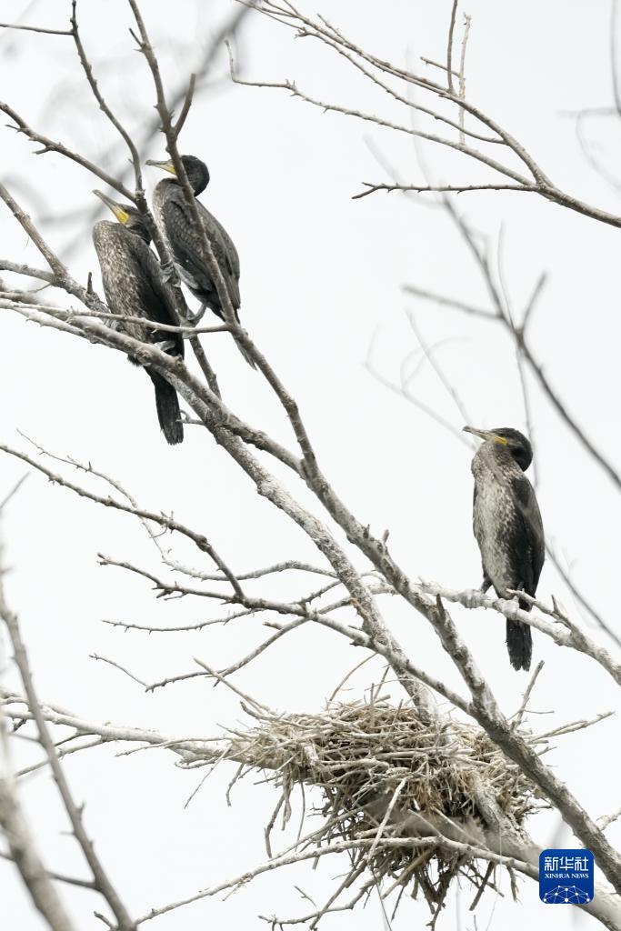 準備學(xué)習飛翔的幾只鸕鶿幼鳥(niǎo)棲息在密云水庫“鳥(niǎo)島”的樹(shù)上(5月31日攝)。