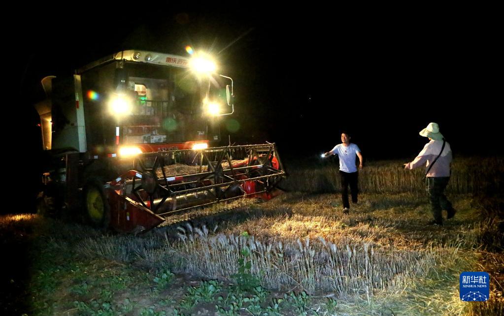 5月31日晚上,河南省洛陽(yáng)市汝陽(yáng)縣蔡店鄉蔡店村組織收割機在搶收小麥。