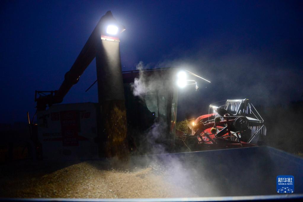 6月1日晚,大型收割機在河南省駐馬店市汝南縣老君廟鎮搶收小麥。