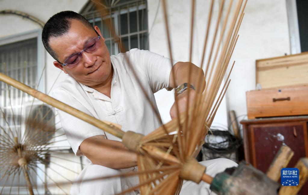 6月1日,在廣西賓陽(yáng)縣賓州鎮陸村,陸云崗在制作油紙傘。