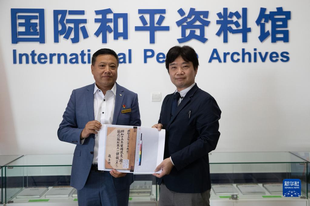 6月1日,日本學(xué)者松野誠也(右)將影印資料贈予黑龍江外國語(yǔ)學(xué)院國際和平資料館。