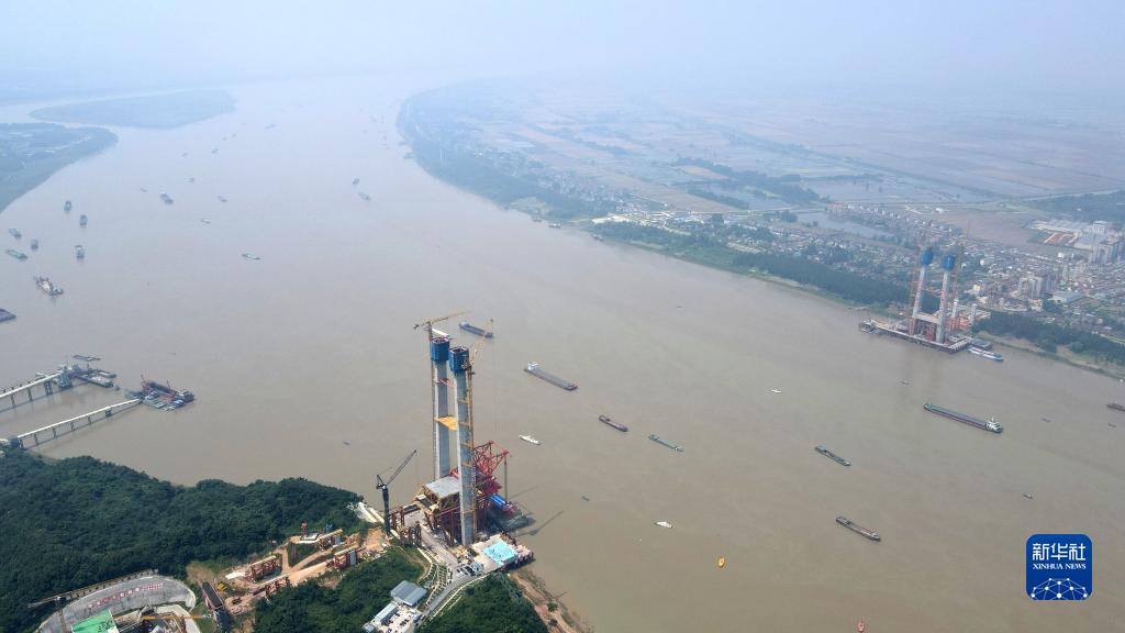 6月2日拍攝的封頂后的京臺高速銅陵長(cháng)江公鐵大橋4號主塔(畫(huà)面左側)(無(wú)人機照片)。