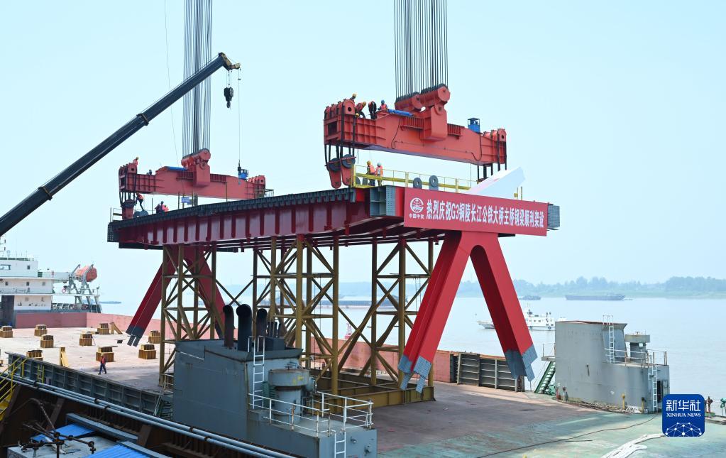 6月2日拍攝的京臺高速銅陵長(cháng)江公鐵大橋主橋鋼梁架設施工現場(chǎng)。