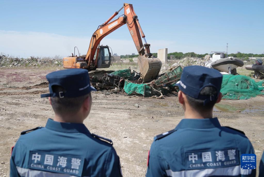 6月2日,工作人員在現場(chǎng)銷(xiāo)毀非法捕撈工具。