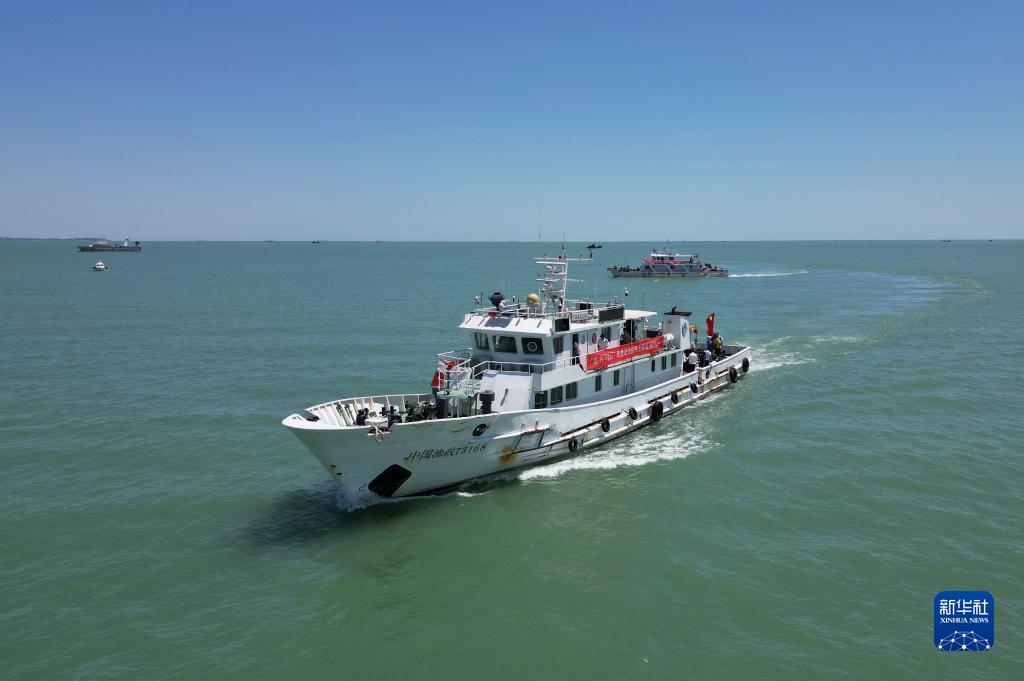 6月2日,參加增殖放流活動(dòng)的船只向秦皇島市北戴河新區海洋漁業(yè)資源增殖放流基地海域航行(無(wú)人機照片)。