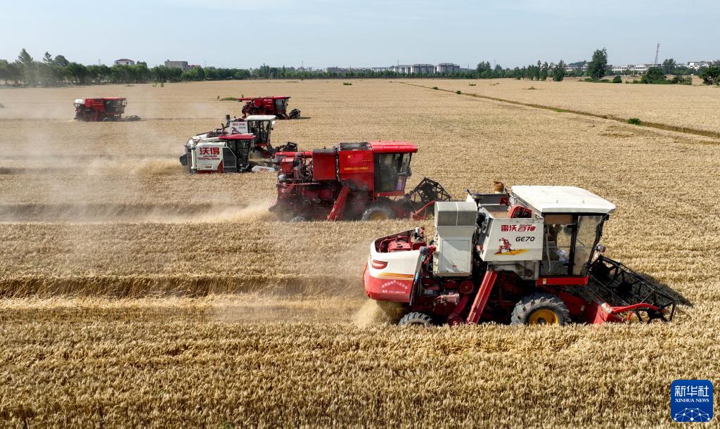 6月2日,在安徽省亳州市利辛縣胡集鎮張莊村明遠種植專(zhuān)業(yè)合作社,農機手駕駛收割機搶收小麥(無(wú)人機照片)。