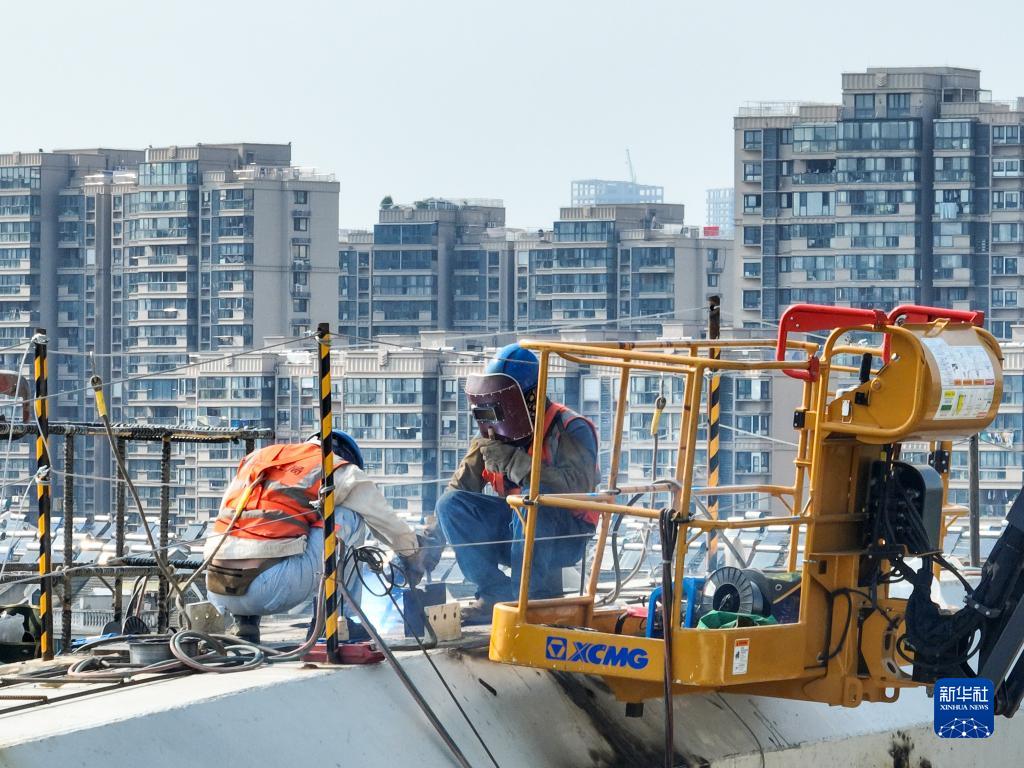 6月2日,中建三局的工程人員在南京梅苑南路跨秦淮新河大橋施工現場(chǎng)進(jìn)行焊接作業(yè)(無(wú)人機照片)。
