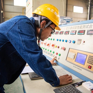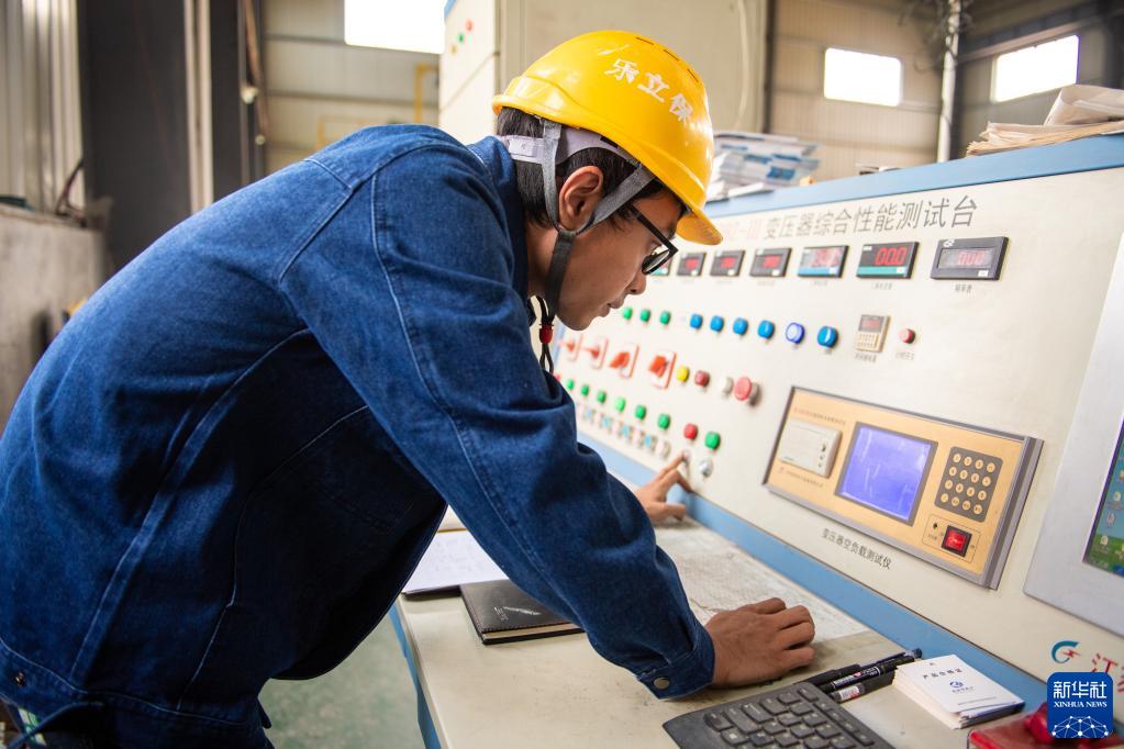 6月2日,在位于婁底經(jīng)開(kāi)區的湖南樂(lè )立保電氣有限公司,工人在檢測變壓器性能。