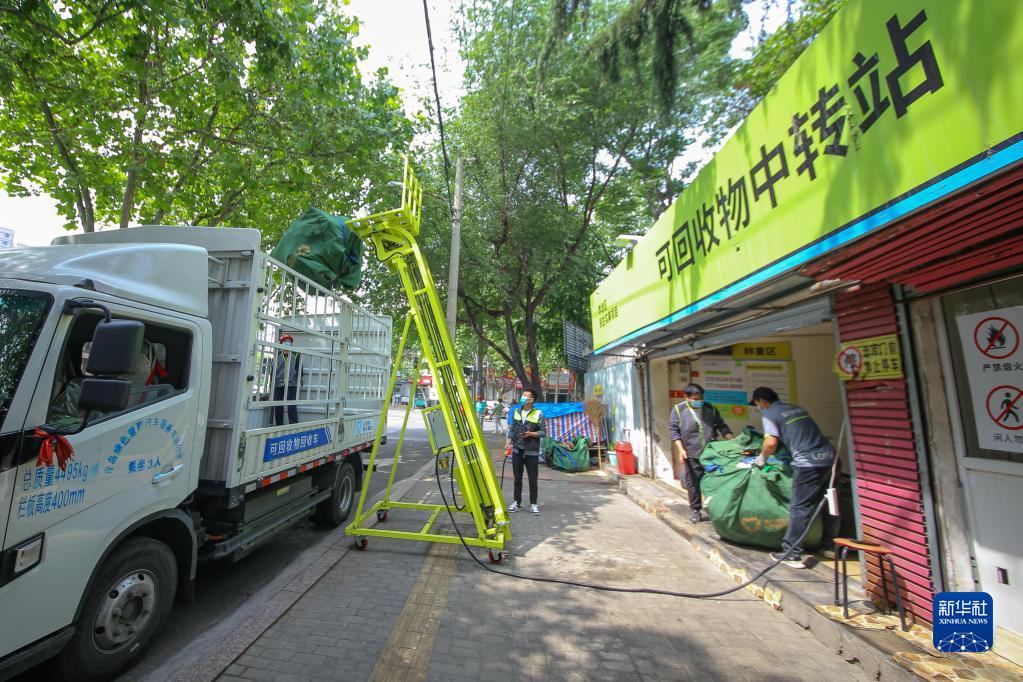 6月2日,在山東省青島市李滄區李村街道可回收物中轉站,工作人員將可回收物裝車(chē)。
