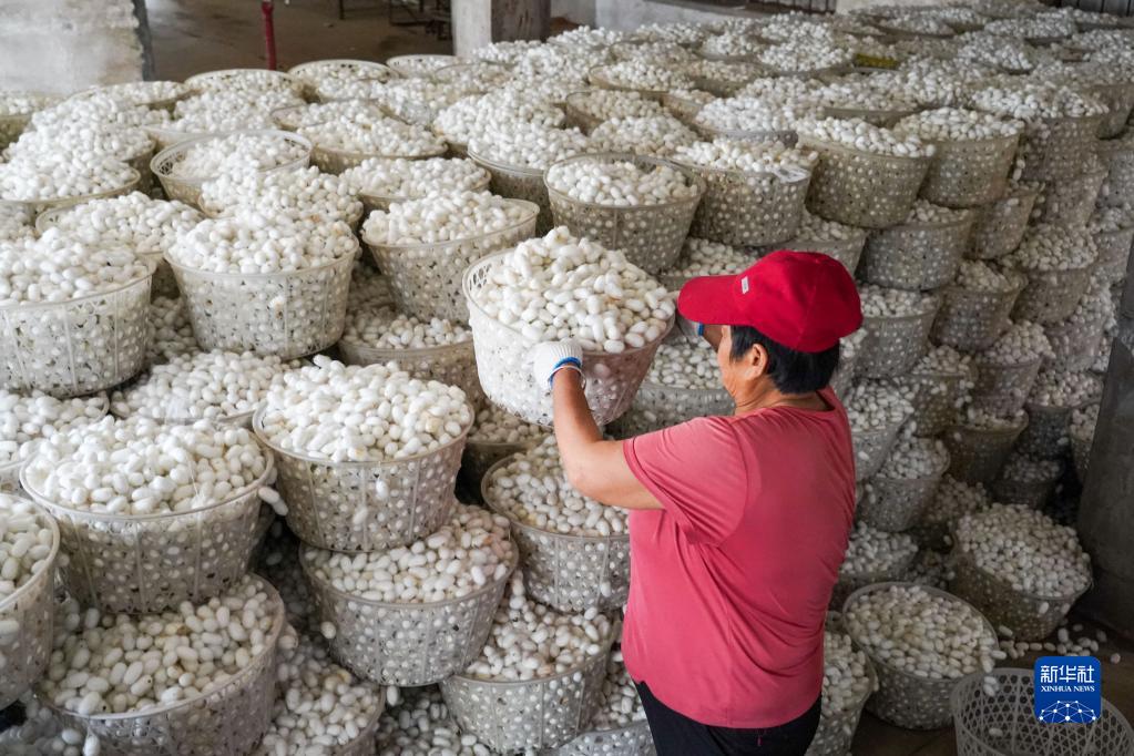 6月2日,工作人員在祝陽(yáng)鎮蠶繭站內分類(lèi)整理收購來(lái)的蠶繭。