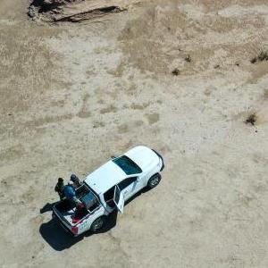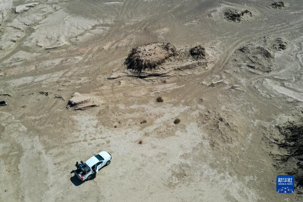 6月2日,額濟納旗文物保護中心工作人員在戈壁灘上巡護(無(wú)人機照片)。
