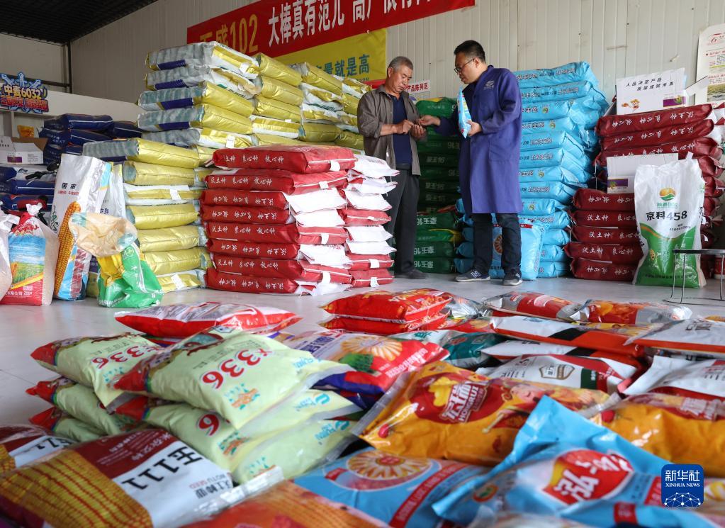 6月3日,河北省晉州市一家種子銷(xiāo)售站的工作人員(右)向采購種子的農民介紹玉米種子的特點(diǎn)。