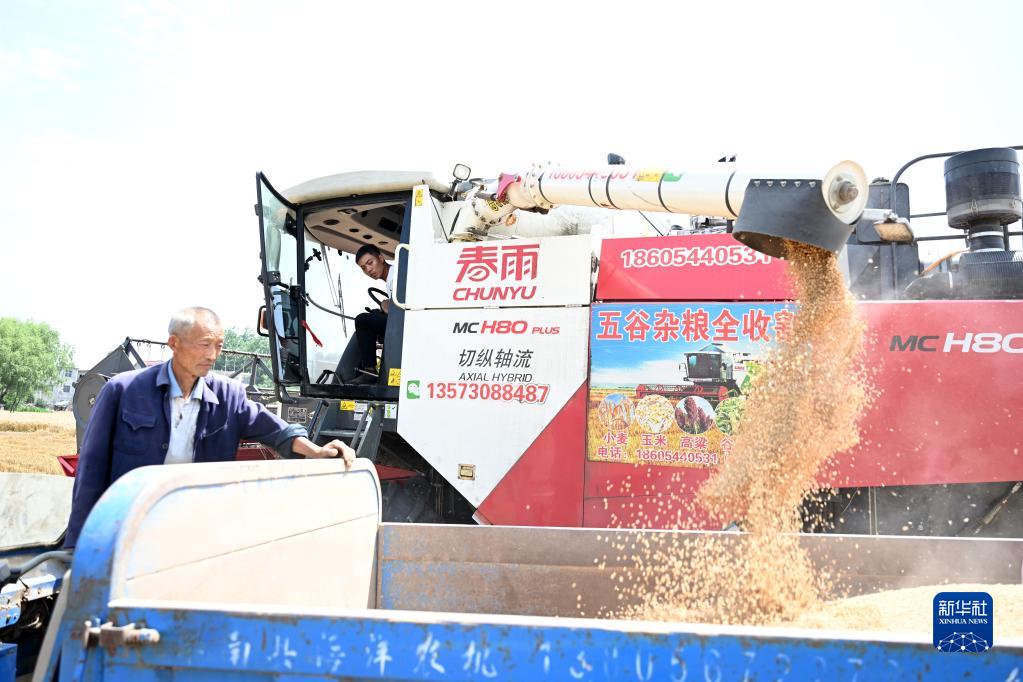 6月2日,在安徽省阜陽(yáng)市阜南縣許堂鄉劉崗村,董斐斐駕駛收割機將收割的小麥裝車(chē)。