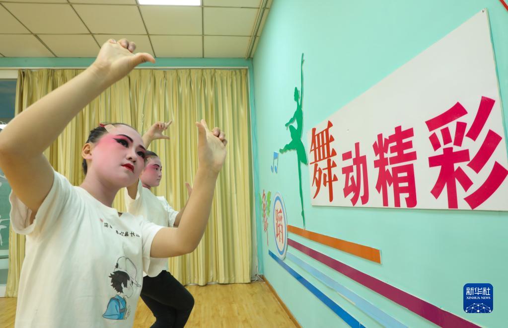 6月3日,在肥西縣桃花鎮柏堰社區新時(shí)代文明實(shí)踐站,小朋友在練習戲曲動(dòng)作。