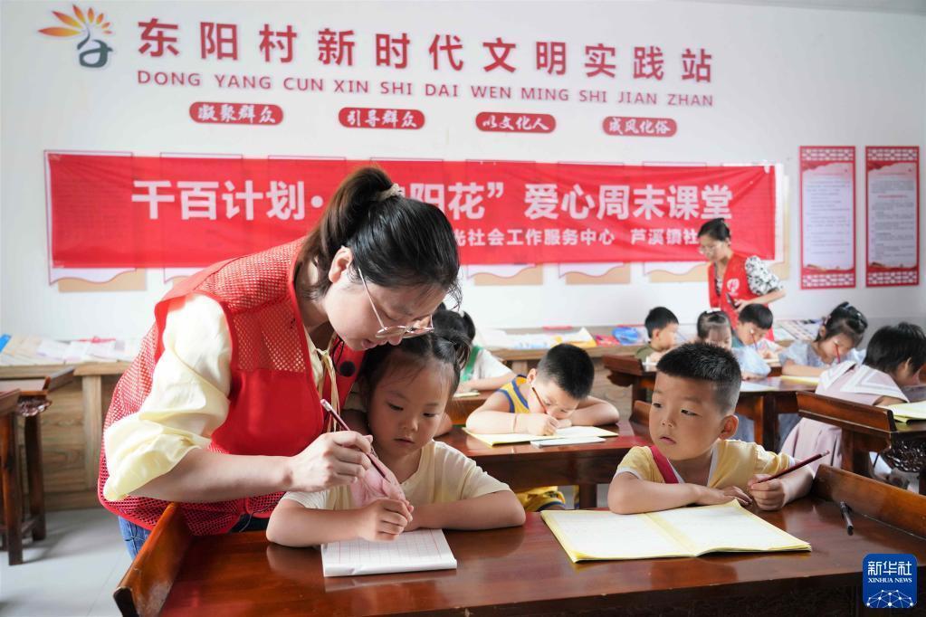 6月3日,江西省萍鄉市蘆溪縣蘆溪鎮東陽(yáng)村部分留守兒童在“愛(ài)心周末課堂”學(xué)習書(shū)法。